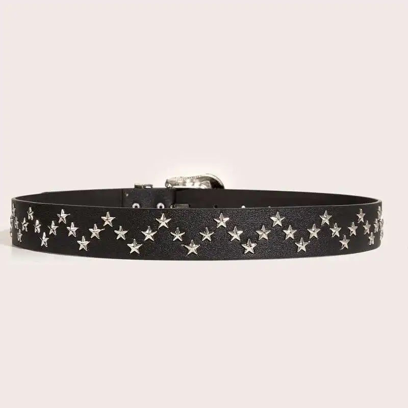 Bring a bold western edge to your look with the Starstud Western Belt. Crafted from durable PU leather and finished with star-shaped studs, this belt is designed to stand out. The ornate engraved buckle and tip add vintage character, making it a perfect statement accessory for both casual fits and more styled looks.